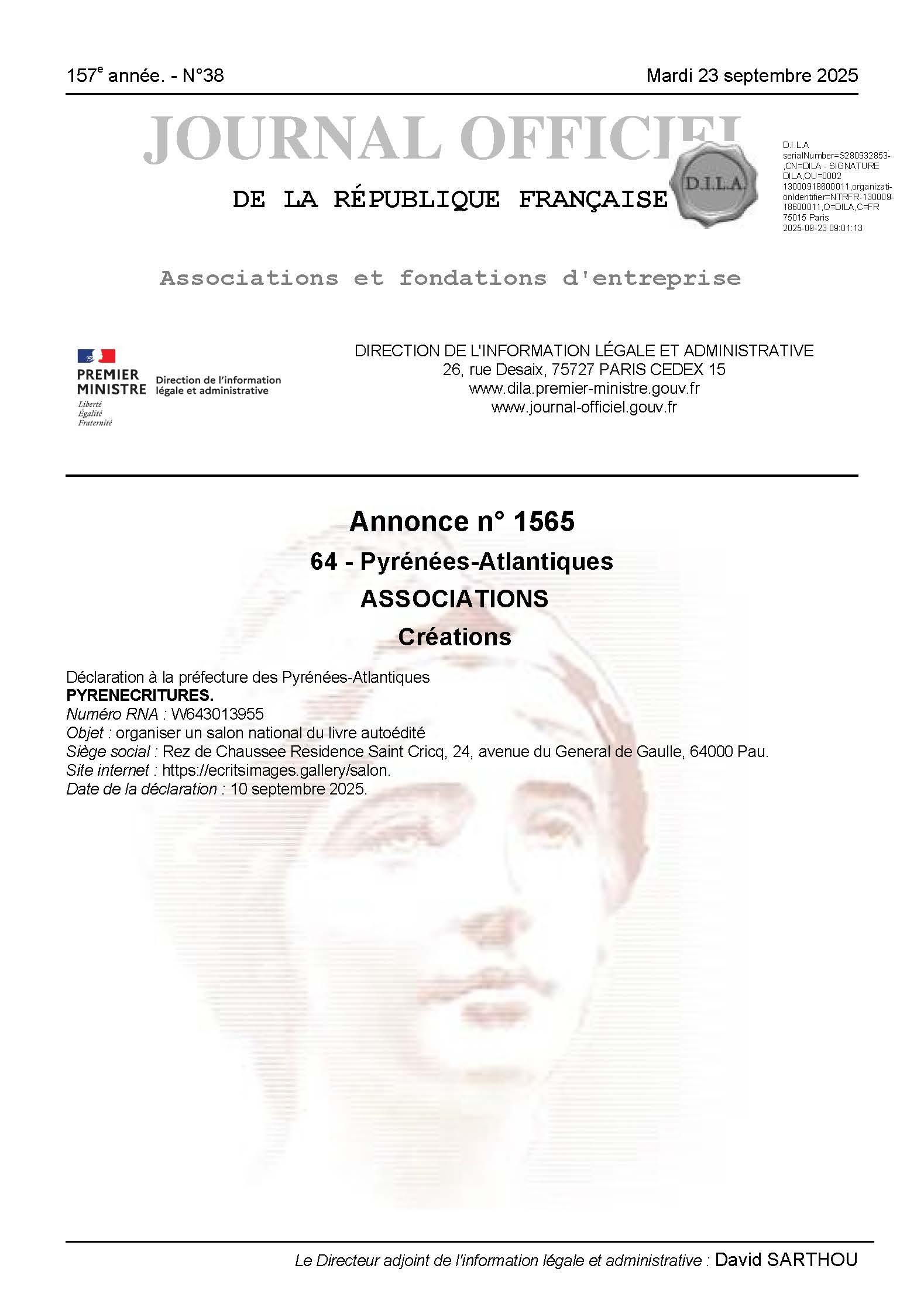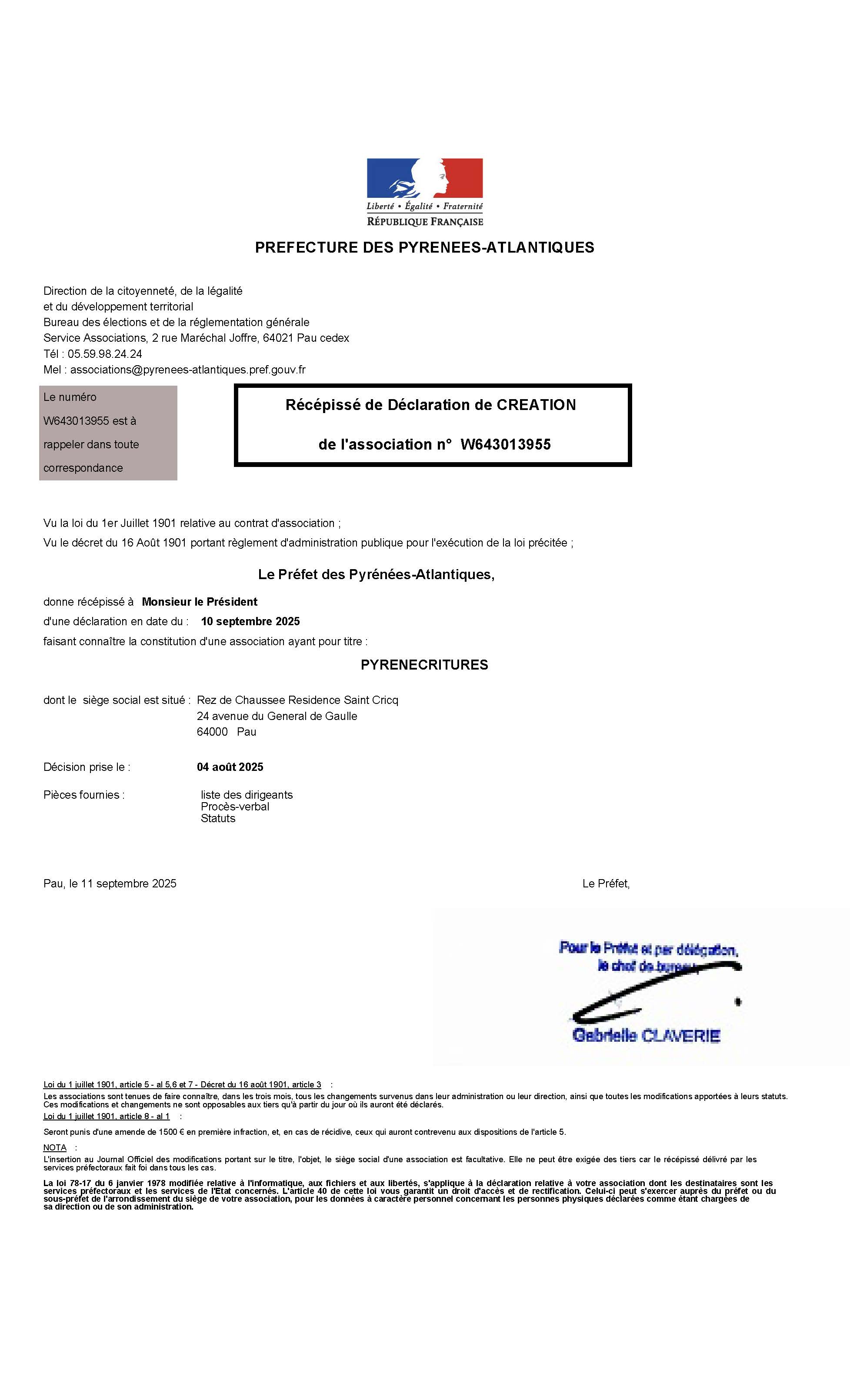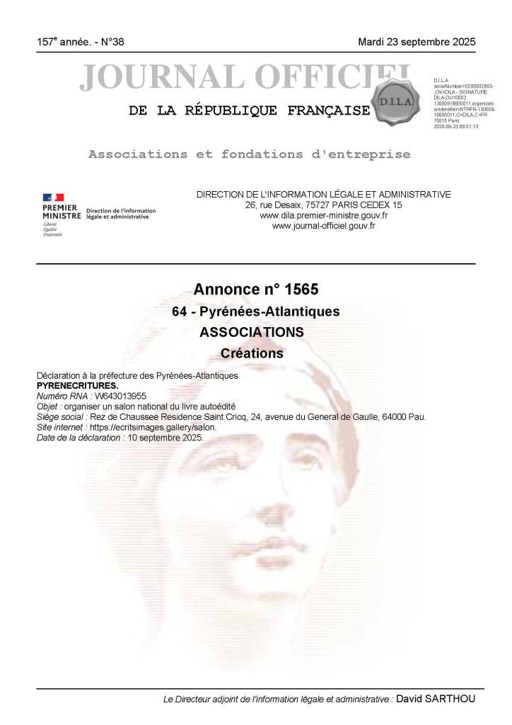 Déclaration en Préfecture de PAU et au Journal Officiel.